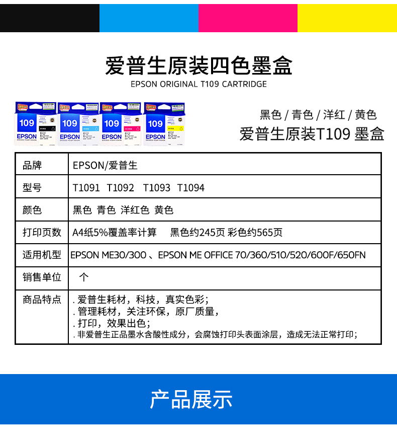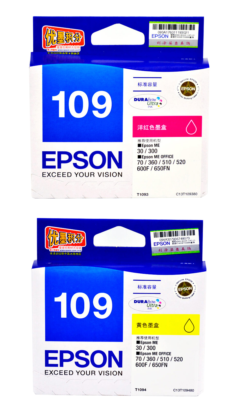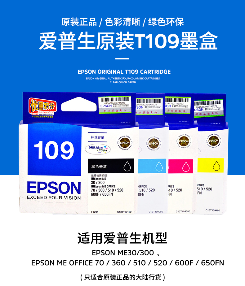 商品名称:爱普生109/1091墨盒 EPSON/ME30/ME300/600F正品墨盒 青色T1092