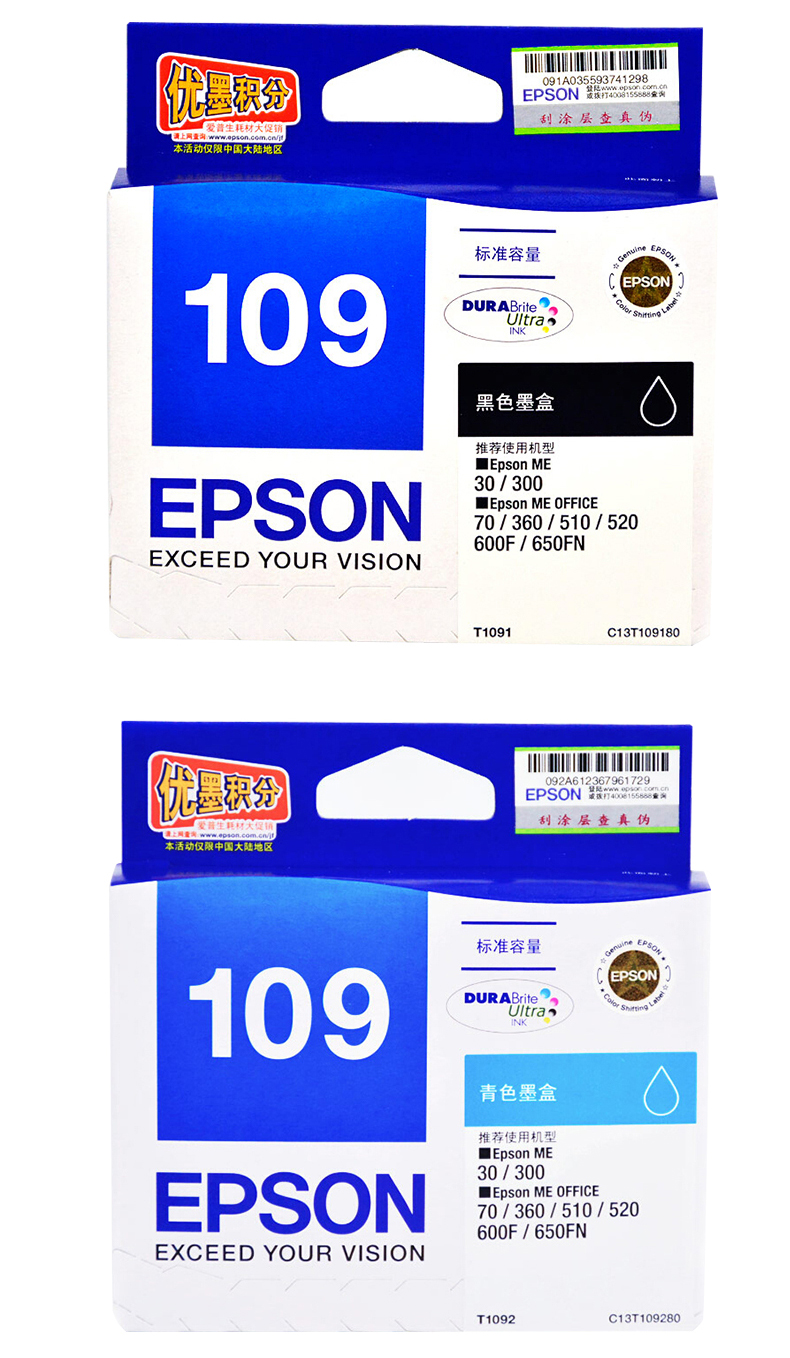 爱普生109/1091墨盒 EPSON/ME30/ME300/600F正品墨盒 青色T1092